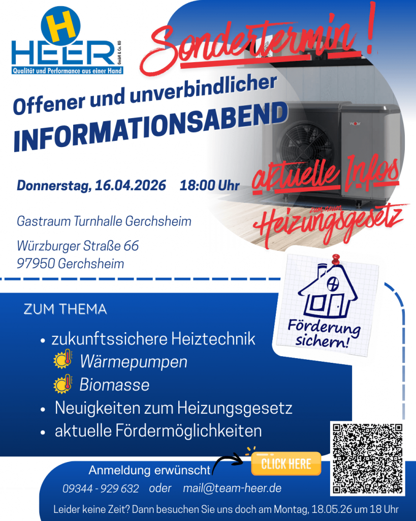 Kommen Sie vorbei! An unserem Informationsabend informieren wir unverbindlich über Wärmepumpen und Biomasse, das aktuelle Heizungsgesetz und die Fördermöglichkeiten.
