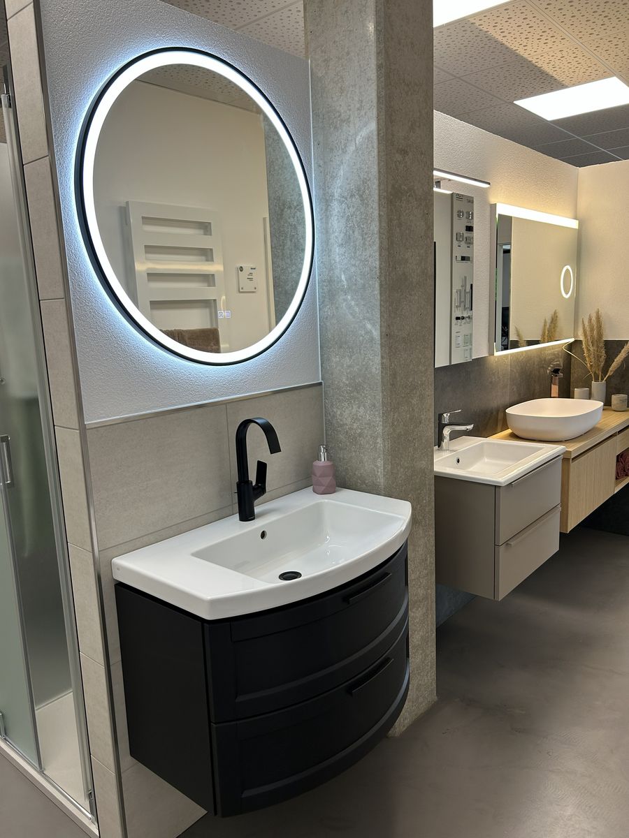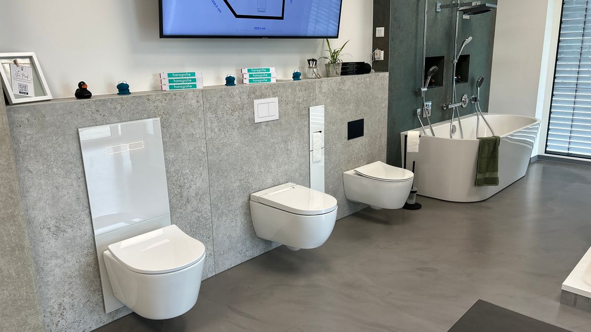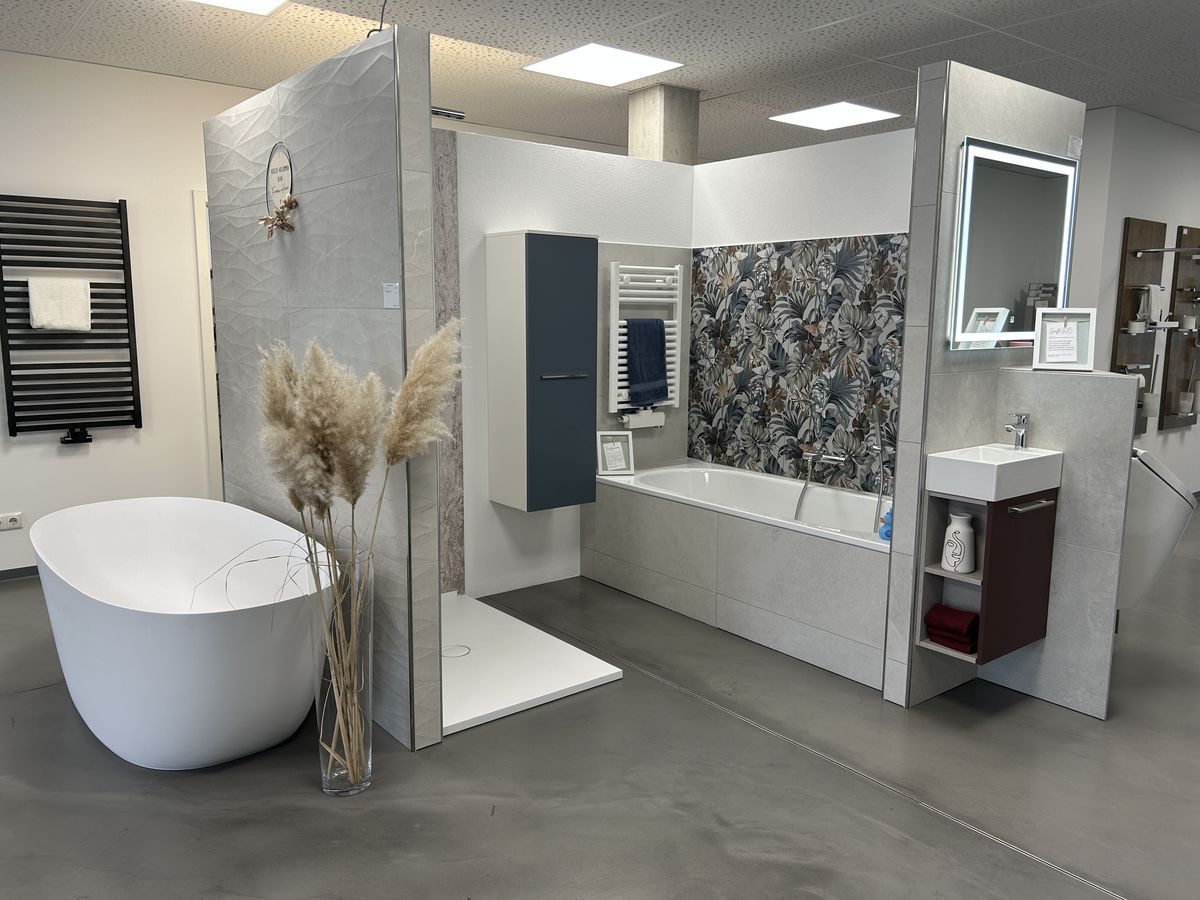 In unserer Bad-Ausstellung können Sie angeschlossene Toiletten, Armaturen sowie Kopf- und Handbrausen live erleben. Ein funktionierendes Infrarot-Paneel und eine Auswahl an Fliesenmustern runden den Besuch ab. So erhalten Sie Inspiration, vergleichen Möglichkeiten und lassen sich persönlich beraten – ganz in Ruhe und praxisnah.